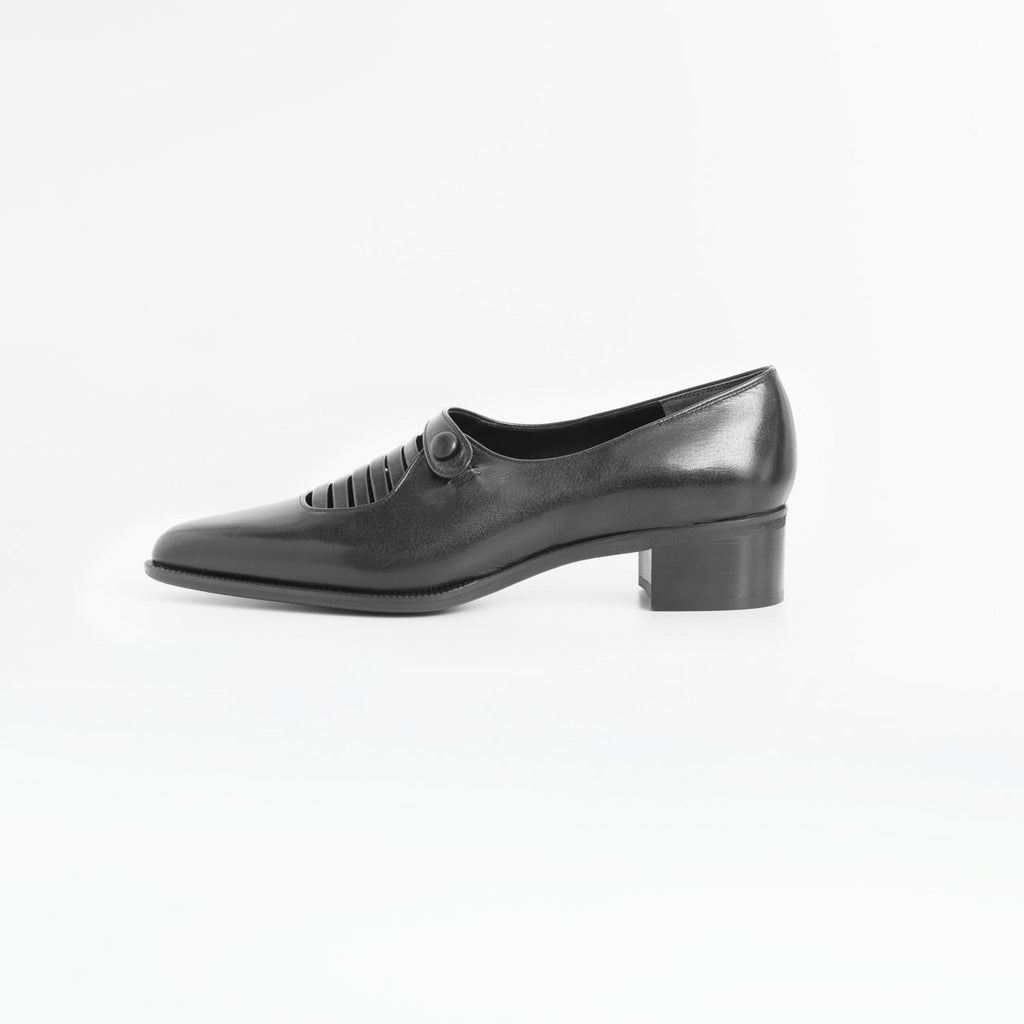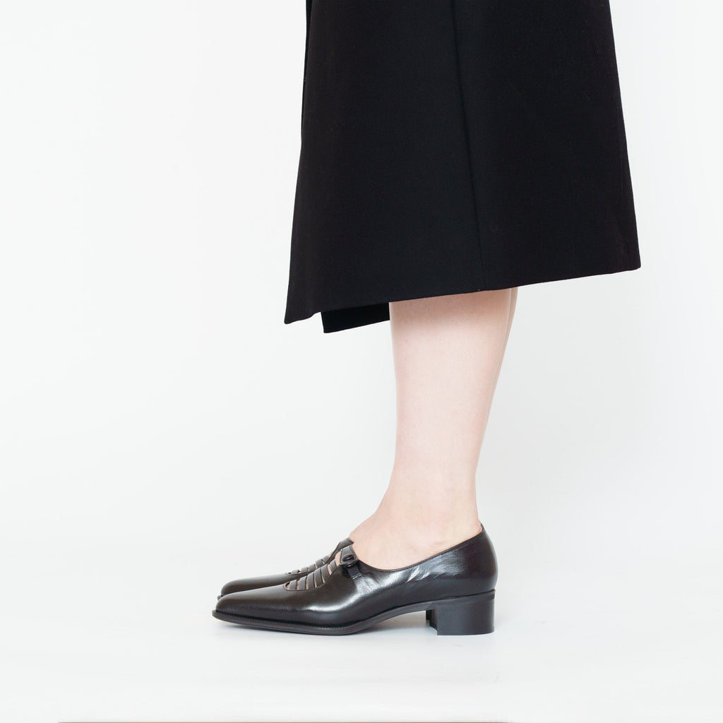 細いパーツでメリージェーンの窓を覆ったデザインが新鮮。暖かな季節には素足で涼やかに、肌寒い季節にはソックスやタイツのカラーを覗かせてオールシーズン楽しめる一足。ワイズは比較的ゆったり目、指先が圧迫されないロングノーズでTHEEDのデビューと同時に名木型とのお声を頂いているラスト2735Pを使用。足入れはTHEEDより細めの作りとなります。