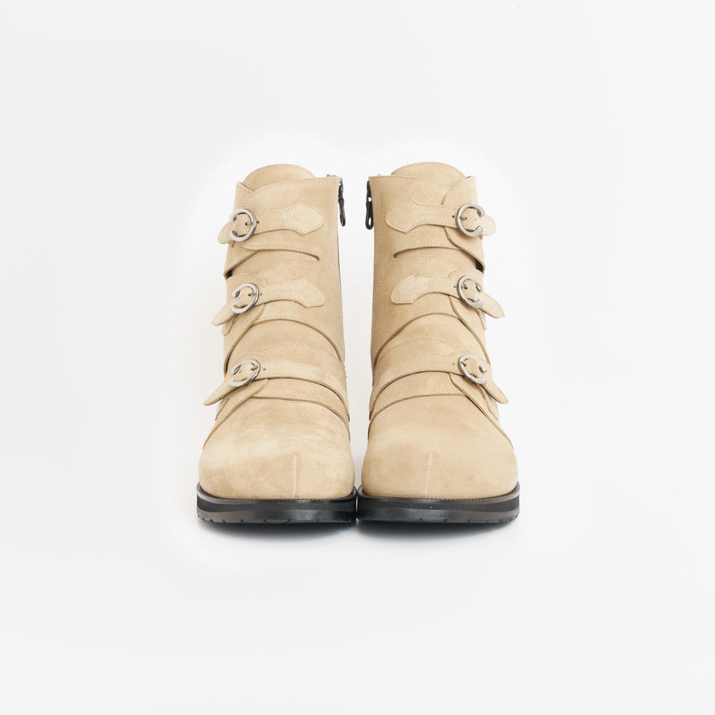 スキー靴から着想を得たボリューミーなミドル丈ブーツ。内蔵した弾力のあるソフトなフットベッドが指周りから足の裏全体をゆったりとモチモチしたテクスチャーで地面から伝わる衝撃を吸収してくれます。上質なCharles F Sted のスウェードを一枚革で贅沢に使用し、甲と足首を重ねて覆う部分の各関節部分3箇所をそれぞれバックルで留めました。その日のご自身の足の形状やレッグウェアに合わせて締めたい部分を調節が可能。優しくしっかりとしたフィット感が前滑りや指のつっぱりを防いでくれるため、疲れにくく脱げづらい履き心地を実現。