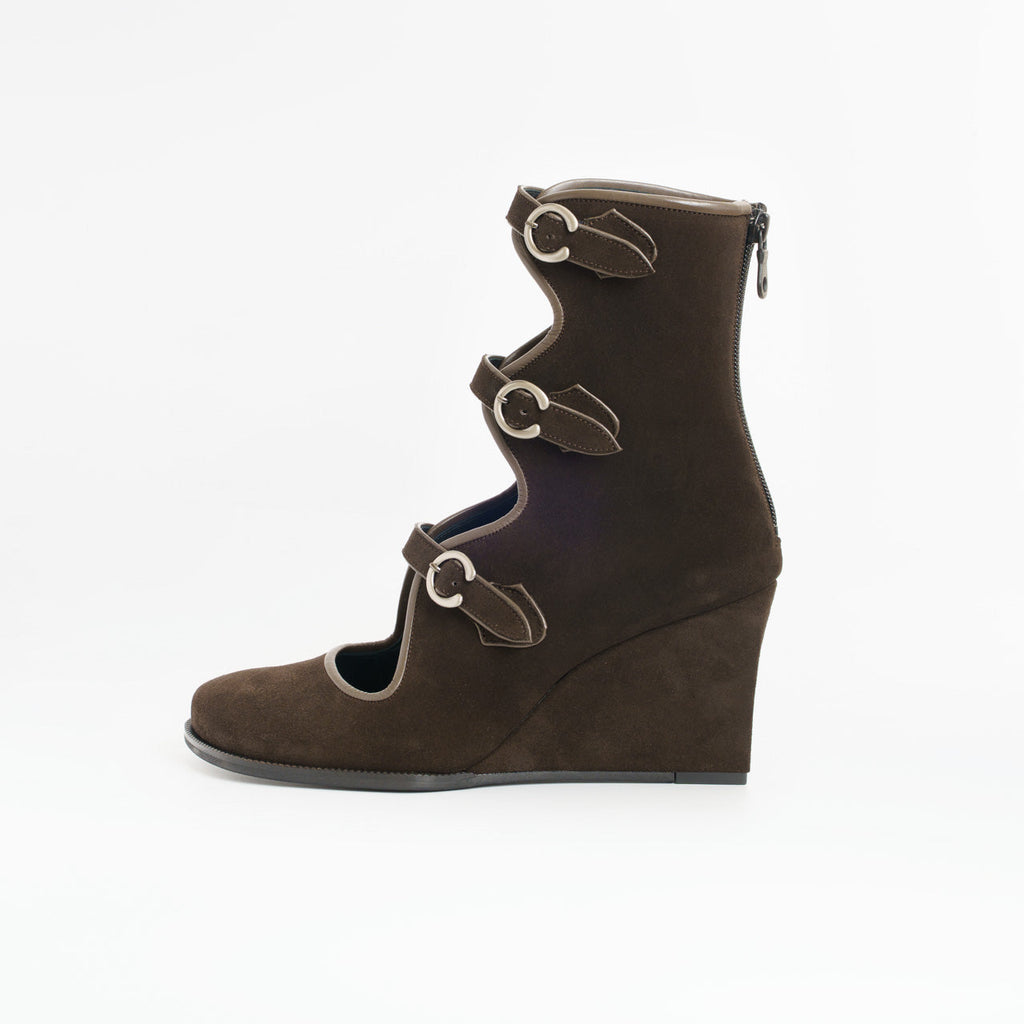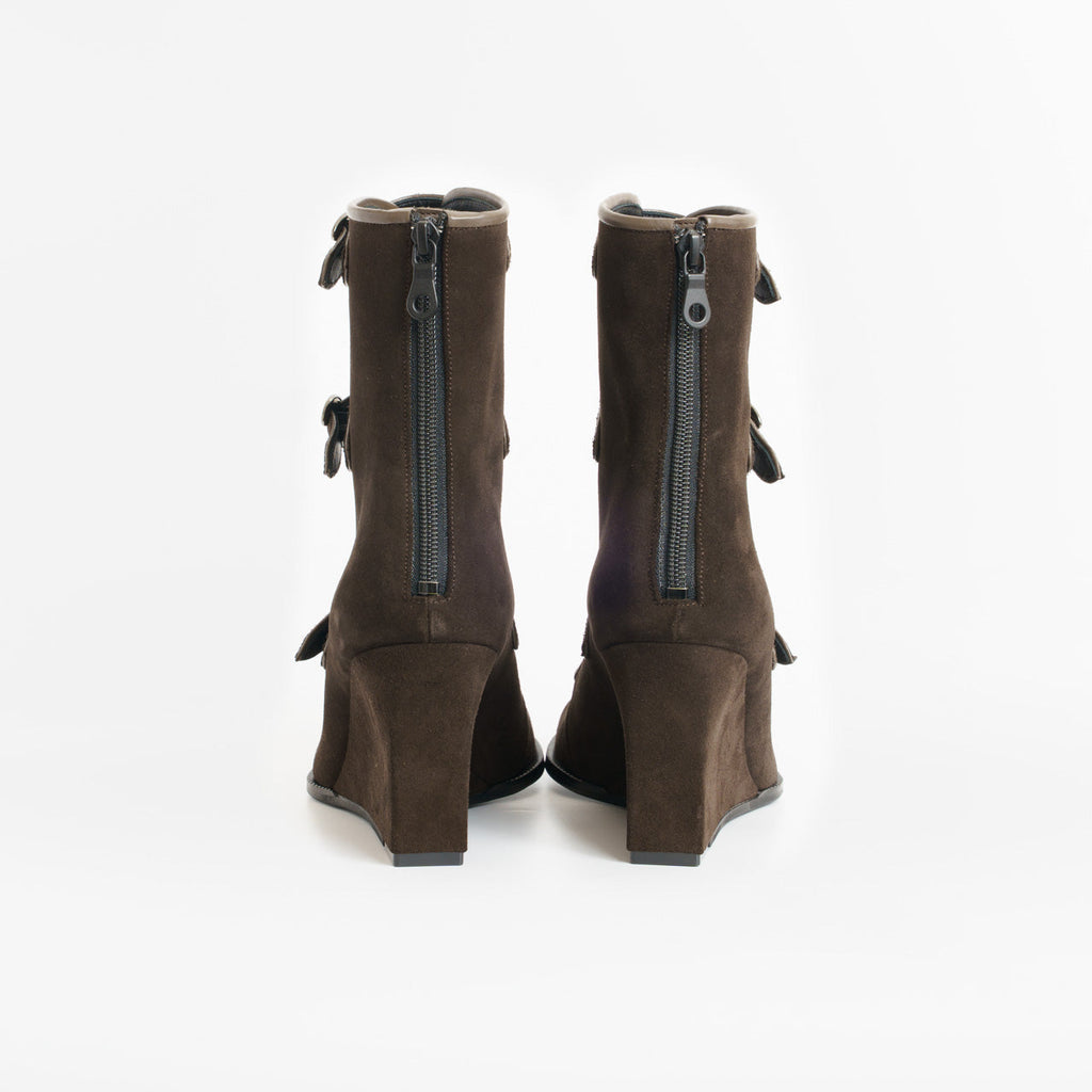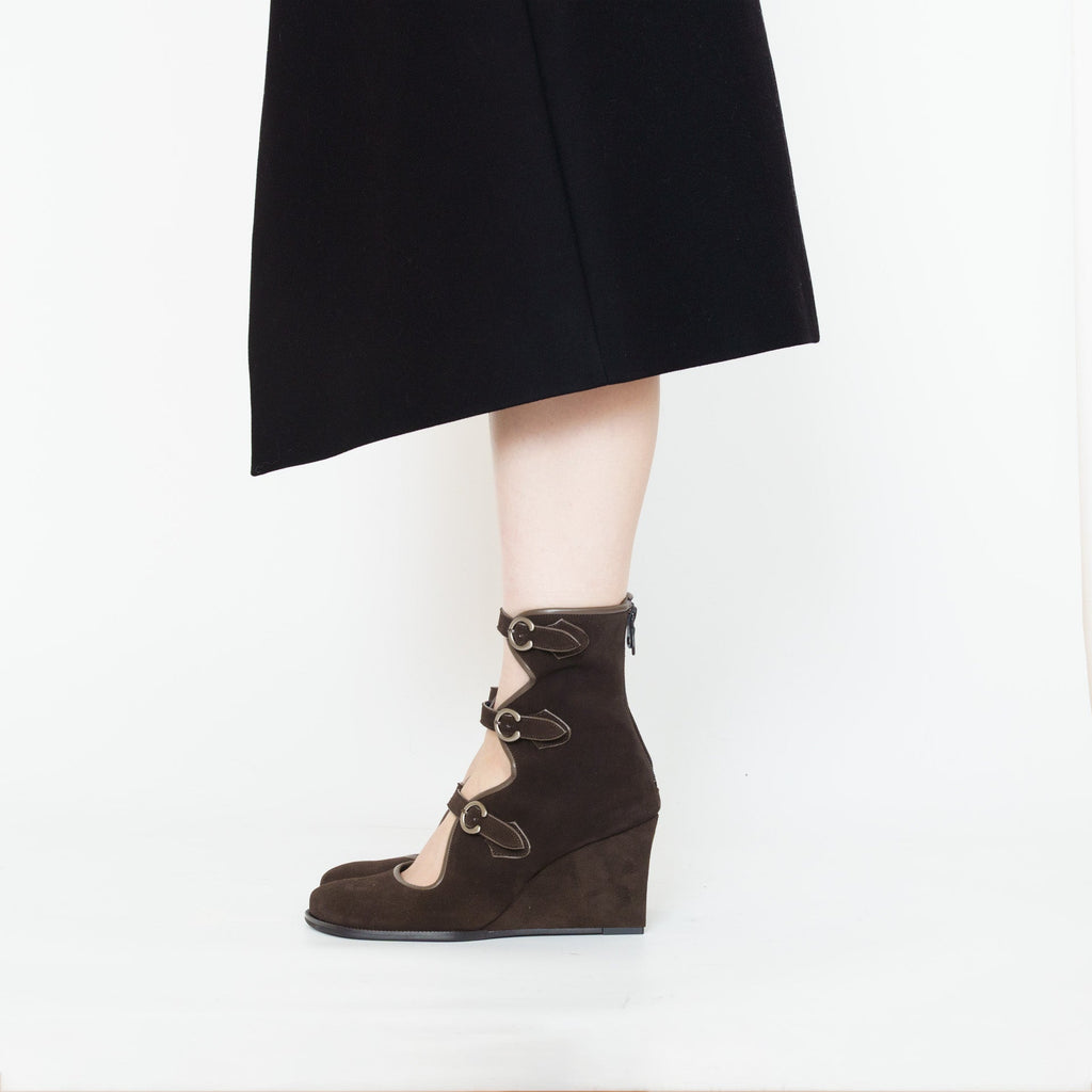 7.5cmの高さを感じさせない足あたりの良さと歩きやすさ、つま先のシャープさを残したボリューム感がスタイリングに重宝するTOYNBEE WEDGEと同じ木型KTM1875PSを使用したミドル丈のブーツ。パンツに合わせればメリージェーンのように、スカートに合わせればコーディネートの主役になるインパクトのあるデザインです。タイツはもちろん素足やハイゲージのリブソックスなどとも好相性。