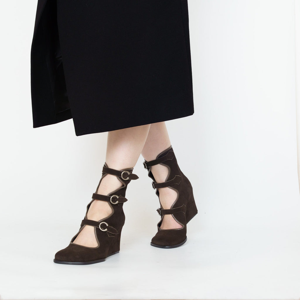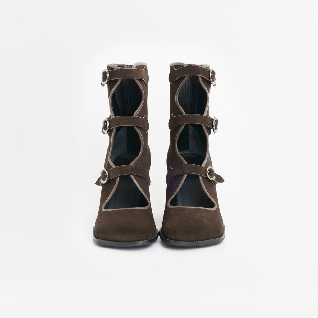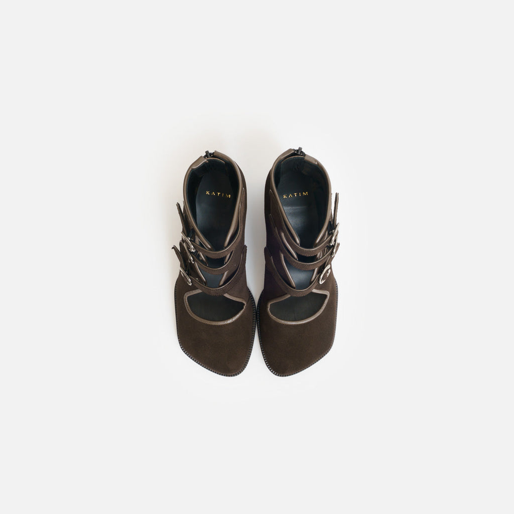7.5cmの高さを感じさせない足あたりの良さと歩きやすさ、つま先のシャープさを残したボリューム感がスタイリングに重宝するTOYNBEE WEDGEと同じ木型KTM1875PSを使用したミドル丈のブーツ。パンツに合わせればメリージェーンのように、スカートに合わせればコーディネートの主役になるインパクトのあるデザインです。タイツはもちろん素足やハイゲージのリブソックスなどとも好相性。