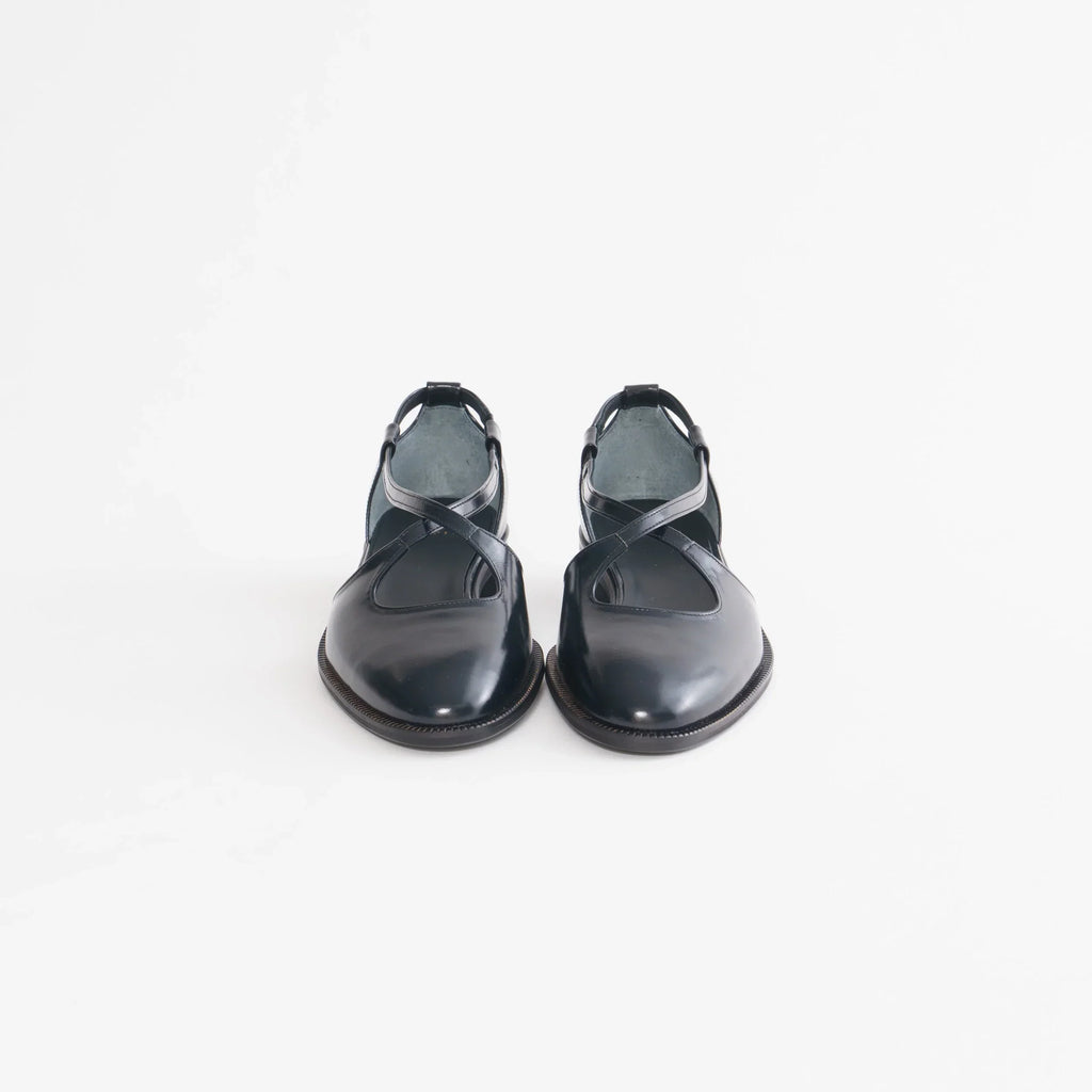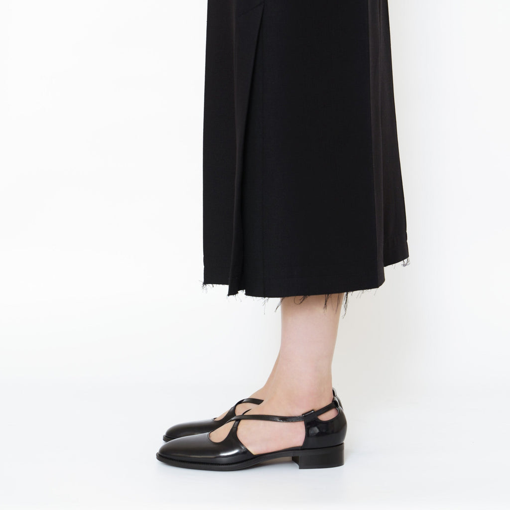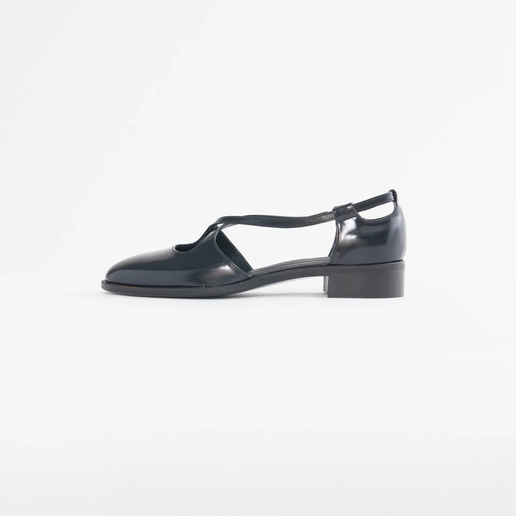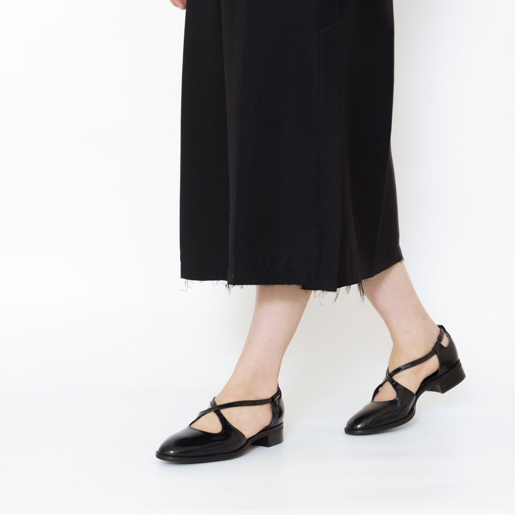 パンプスでも短靴でもない、ドレスシューズとしか言いようのない絶妙なフォルムの木型1925Rを使用したクロスストラップセパレートシューズ。甘くなりがちなクロスストラップデザインをベーシックスタイルにアップデート。ヒールパーツの中に仕込んだ隠しシャーリングでスリッポンのような脱ぎ履きが可能。2.5cmヒールの積み上げでフラットシューズに近い履き心地。ソックスとも好相性です。PORTOBELLOやSPENCERでお馴染みの人気の木型KTM1130Sとほぼ同じサイズ感です。